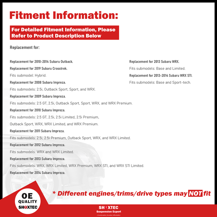 - Fits submodels: 2.5 GT, 2.5i, 2.5i Limited, 2.5i Premium, Outback Sport, WRX, WRX Limited, and WRX Premium.